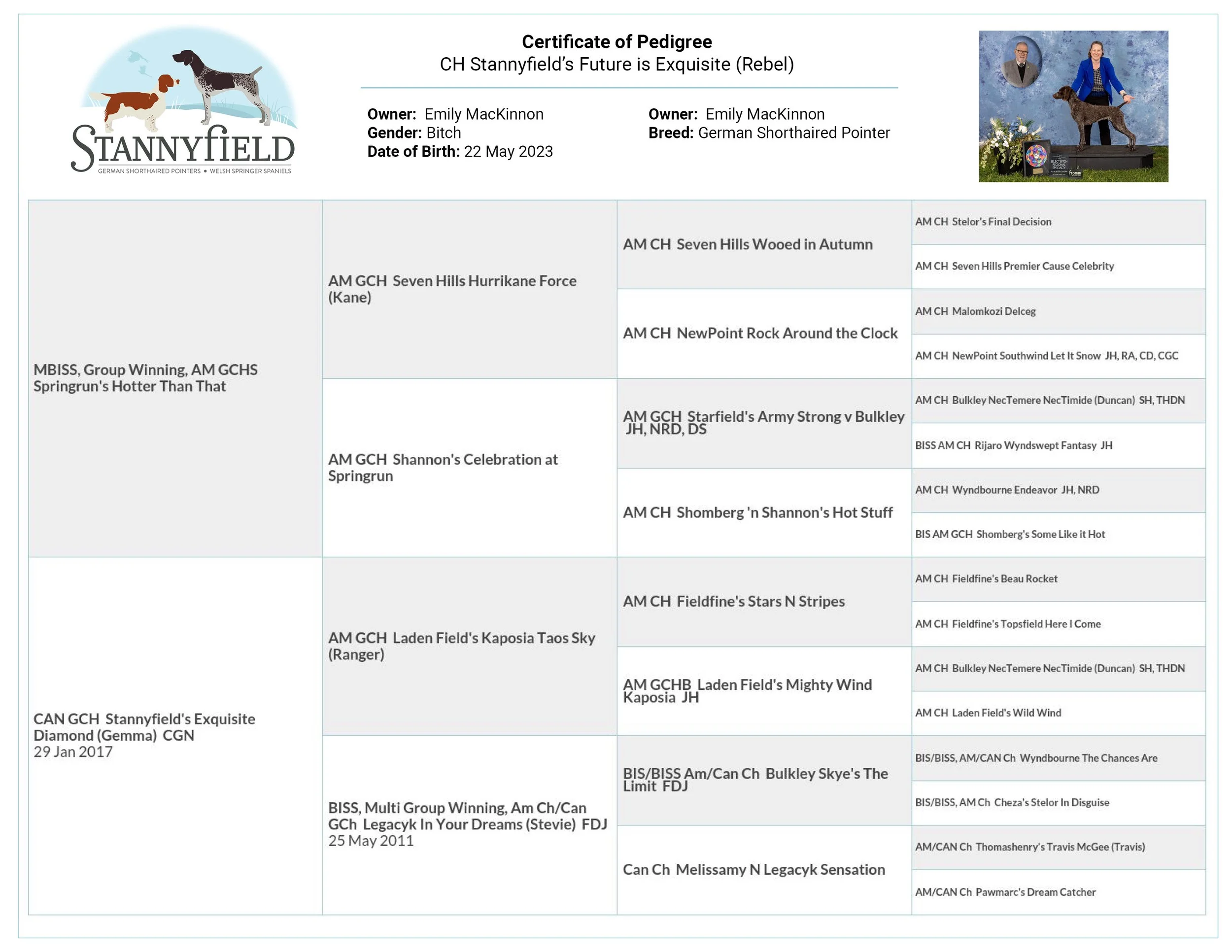 CH Stannyfield’s Future is Exquisite “Rebel”Health Clearances CAER: Pending | Hips: Pending | Elbows: Pending | Cardiac: Pending | CD: Pending