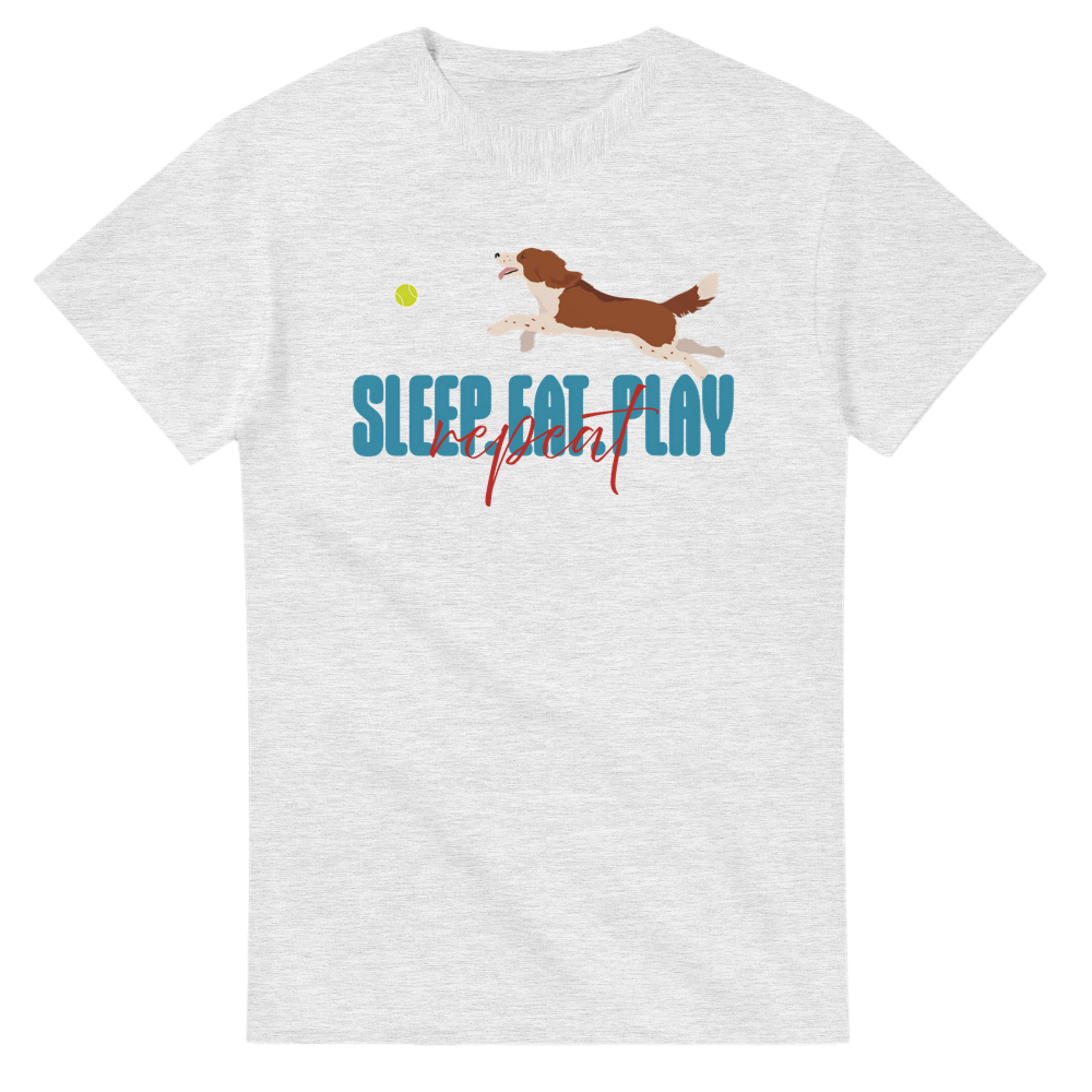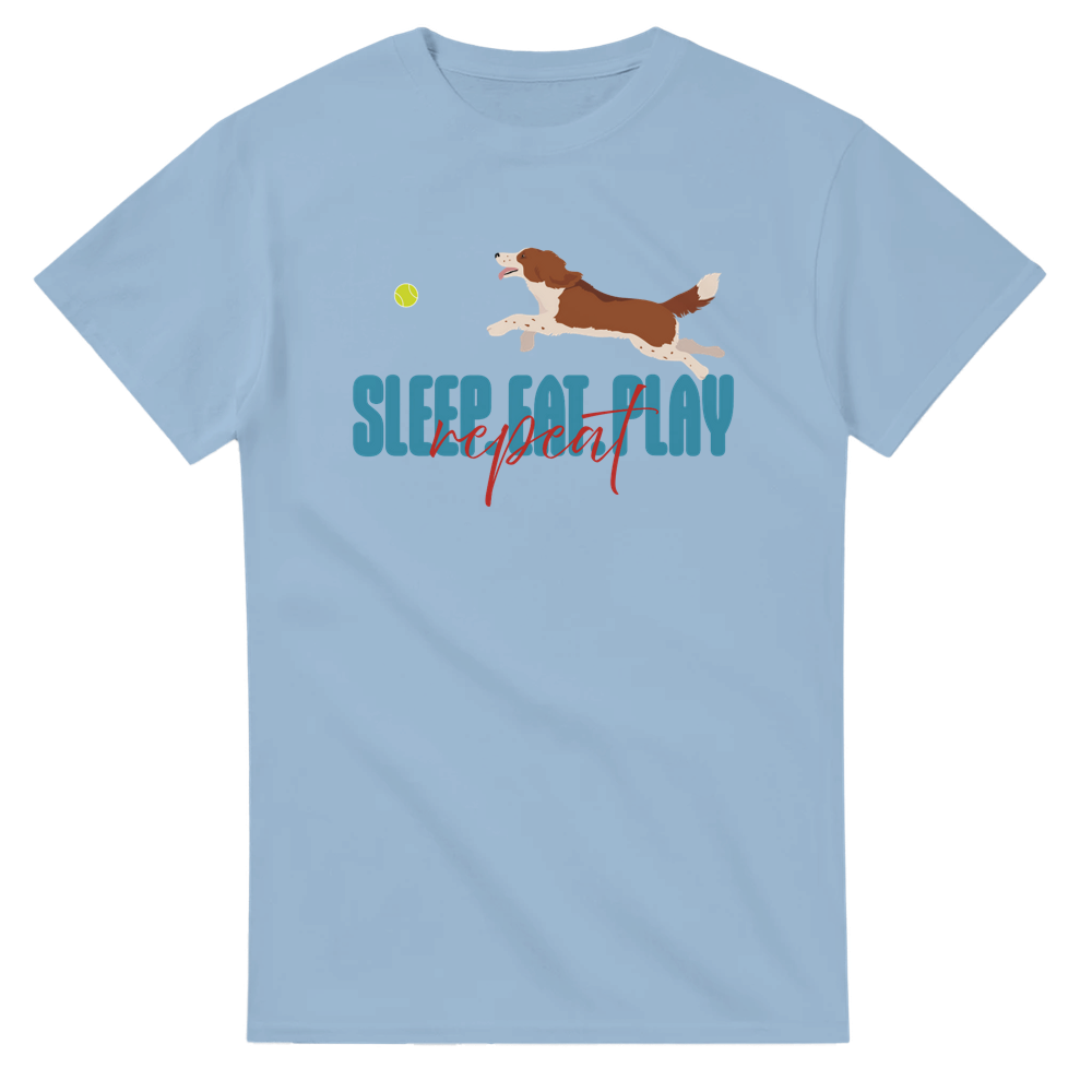 Celebrate the Welsh Springer Spaniel’s mantra with a Sleep Eat Play Repeat unisex t-shirt, featuring a playful Welsh Springer Spaniel. A perfect gift for spaniel fans.