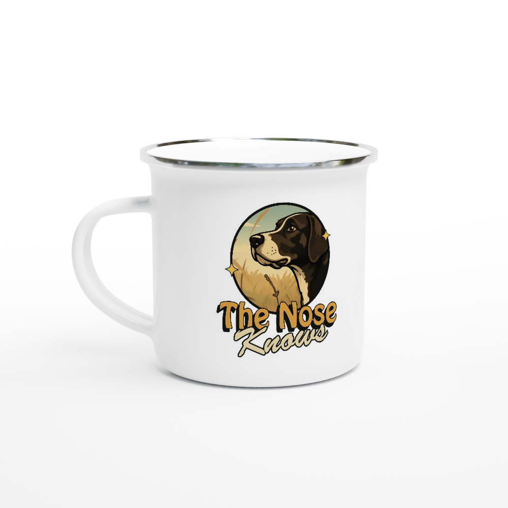 Start your day with a touch of humor and style with our captivating 12 oz enamel mug featuring a charming German Shorthaired Pointer (GSP) sniffing the air. This retro design with the phrase 'The Nose Knows' is perfect for dog lovers and hunting enthusiasts alike. Ideal for sipping your favorite warm beverage whether you're at home, at a campsite, or on a hike. Crafted from lightweight enamel, this mug is durable and perfect for outdoor adventures. While it’s great for coffee, tea, or cocoa, please note it is not dishwasher or microwave safe. The classic white coating with a sleek silver rim adds a touch of elegance to your morning routine or camping setup. Don't miss out on this perfect gift for yourself or the outdoor enthusiast in your life. Order now and enjoy your drinks with a wink of canine charm! Enamel 12oz mug NOT dishwasher or microwave safe. White coating with a silver rim